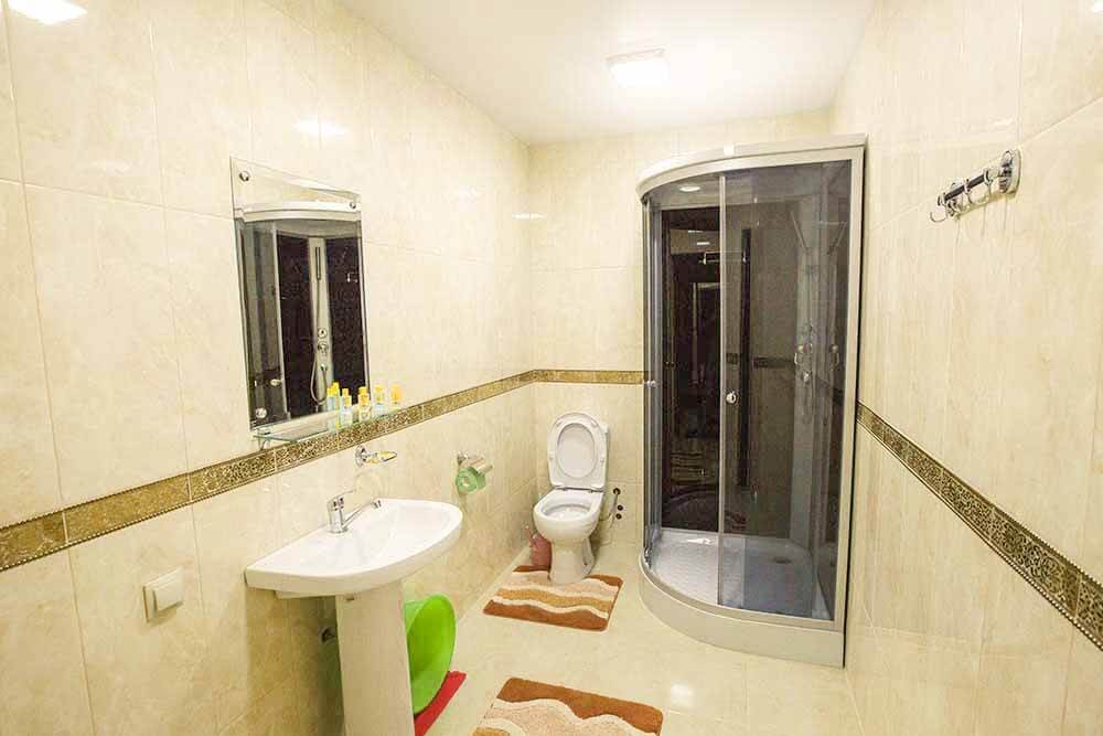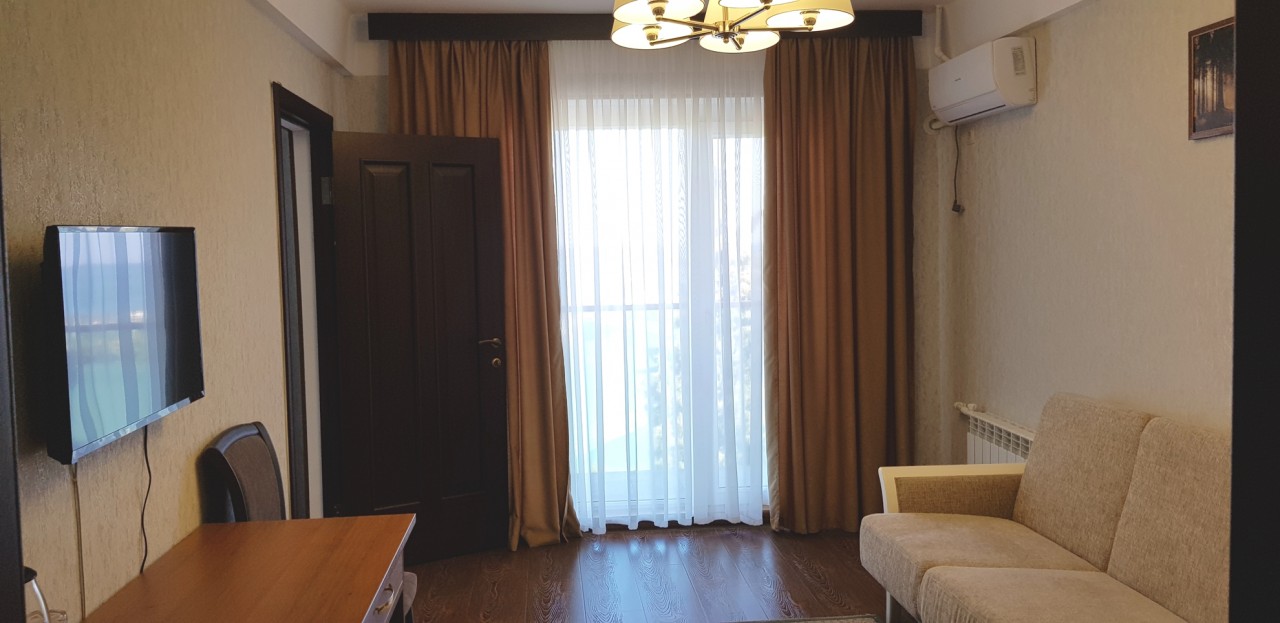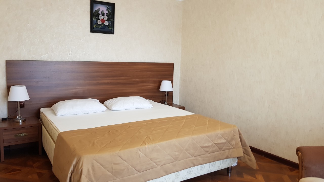 Площадь номера - 32 кв.м. 2 осн. места. 2 доп. места. Балкон. Мебель: диван, зеркало, кровать двуспальная, прикроватные тумбочки, стол, стул, шкаф. Оборудование: кондиционер, телевизор, холодильник. Санузел: с душевой кабиной, туалетные принадлежности. Сервис: смена полотенец, смена постельного белья, уборка номера.