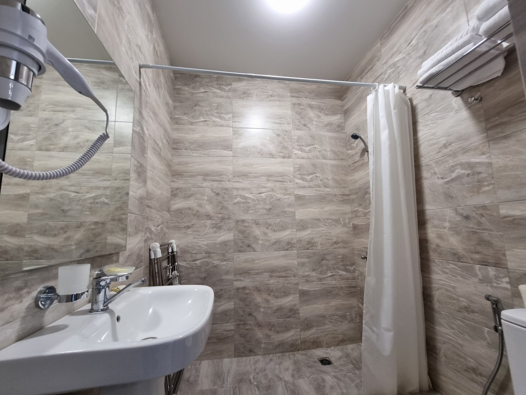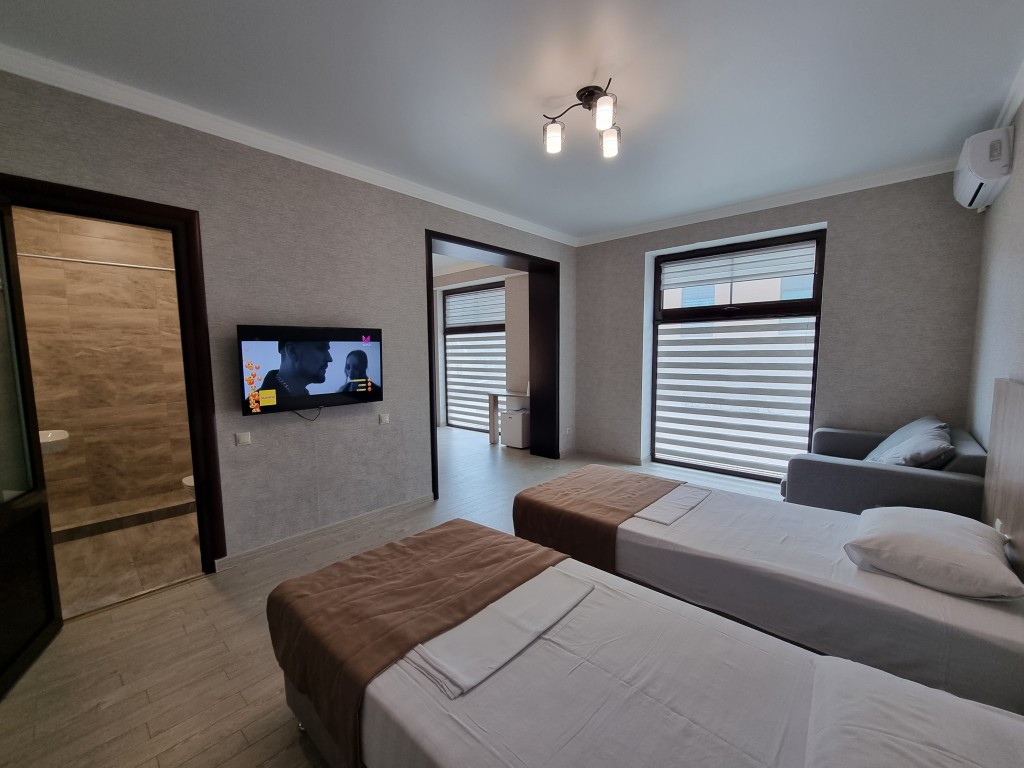 Площадь номера - 32 кв.м. 2 осн. места. 1 доп. место. Мебель: вешалка, кресло, кровати односпальные, прикроватные тумбочки, стол, стул, шкаф. Оборудование: кондиционер, телевизор, холодильник. Санузел. Сервис: Wi-Fi бесплатно, смена полотенец, смена постельного белья, уборка номера.