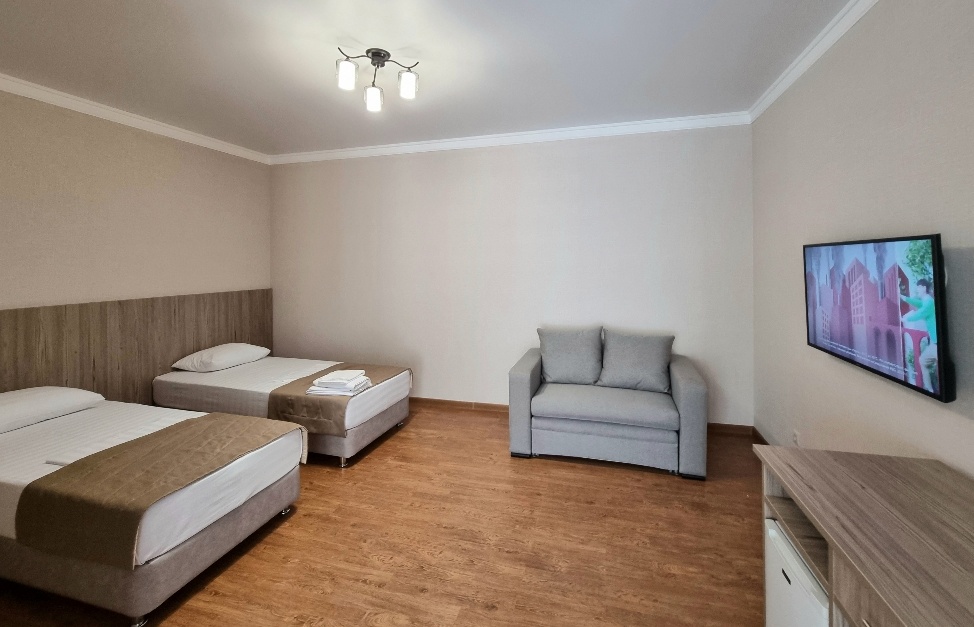 Площадь номера - 24 кв.м. 2 осн. места. 1 доп. место. Мебель: зеркало, кровати односпальные /одна двуспальная кровать, прикроватные тумбочки, стол, стул, шкаф. Оборудование: кондиционер, телевизор, холодильник. Санузел. Сервис: смена полотенец, смена постельного белья, уборка номера.