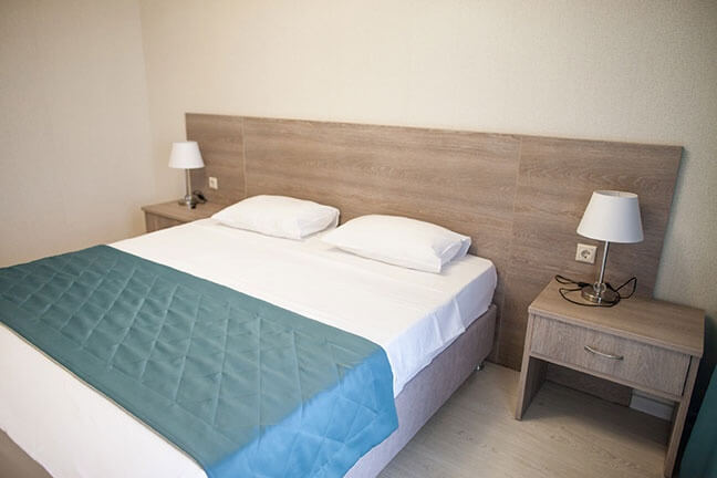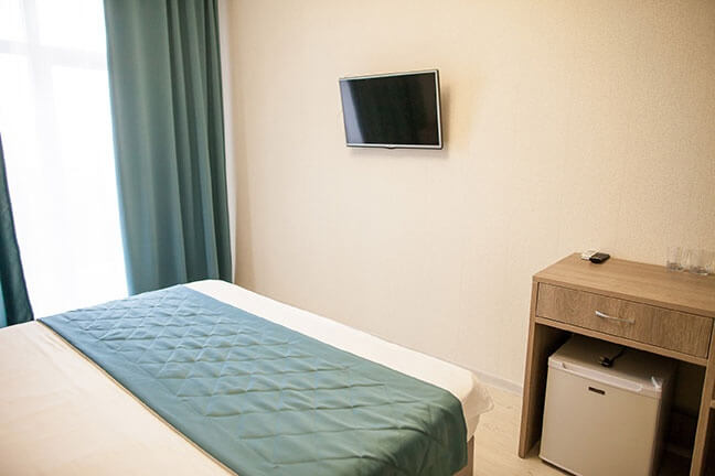 Площадь номера - 16 кв.м. 2 осн. места. 1 доп. место. Балкон. Мебель: зеркало, кровати односпальные, прикроватные тумбочки, стол, стулья, шкаф. Оборудование: кондиционер, телевизор, холодильник. Санузел. Сервис: Wi-Fi бесплатно, смена полотенец, смена постельного белья, уборка номера.