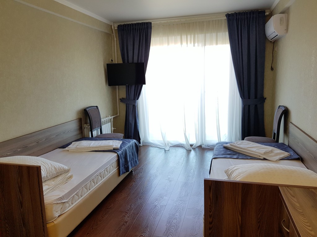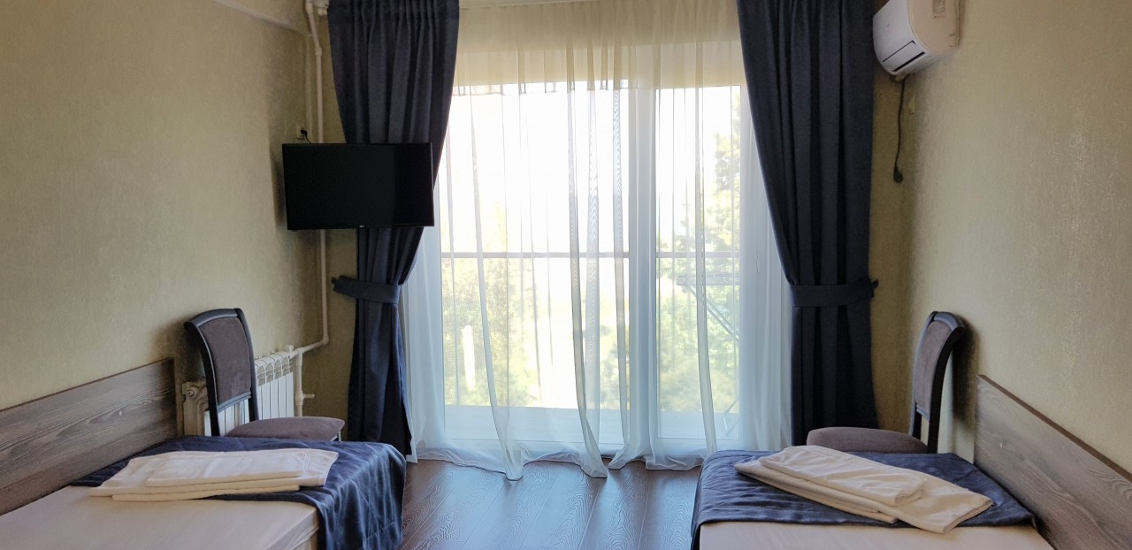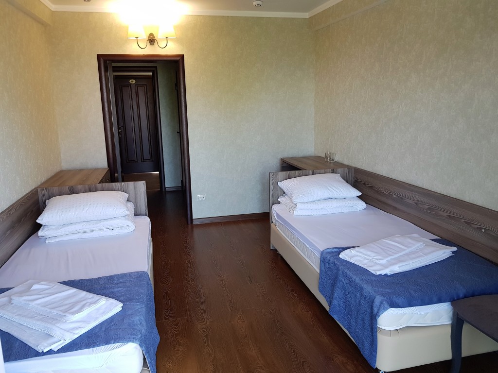 Площадь номера - 16 кв.м. 2 осн. места. 1 доп. место. Балкон. Мебель: зеркало, кровати односпальные, прикроватные тумбочки, стол, стулья, шкаф. Оборудование: кондиционер, телевизор, холодильник. Санузел. Сервис: смена полотенец, смена постельного белья, уборка номера.