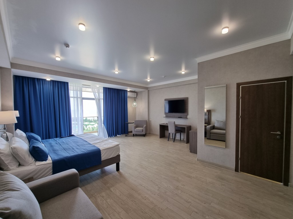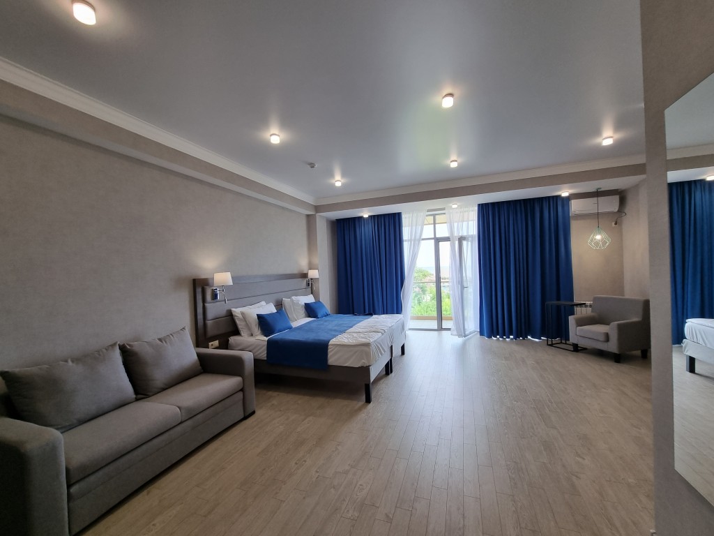 Площадь номера - 39 кв.м. 2 осн. места. 1 доп. место. Балкон. Мебель: вешалка, диван, кресло, кровати односпальные /одна двуспальная кровать, прикроватные тумбочки, стол, стул. Оборудование: кондиционер, телевизор, холодильник. Санузел. Сервис: смена полотенец, смена постельного белья, уборка номера.
